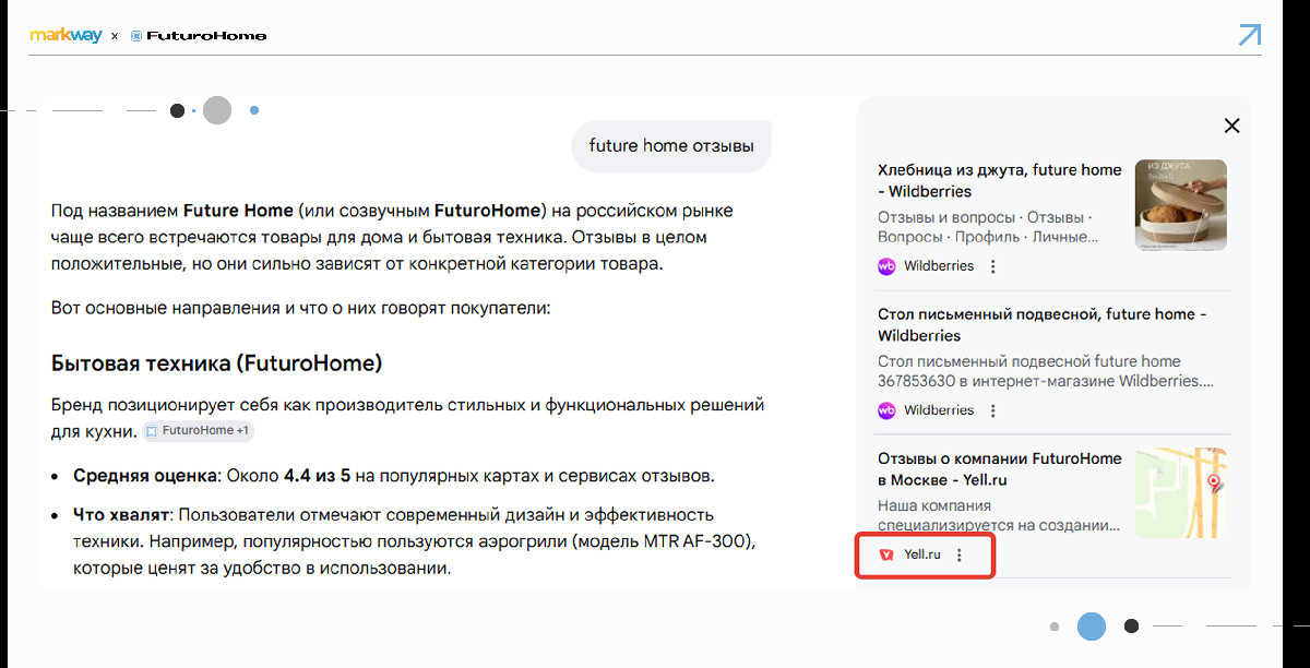 Раньше нейросеть давала общее описание FuturoHome без опоры на пользовательский опыт и могла подтягивать нерелевантные источники. Теперь появились данные из отзывов: нейросеть стала опираться на пользовательские оценки и реальные сценарии использования.