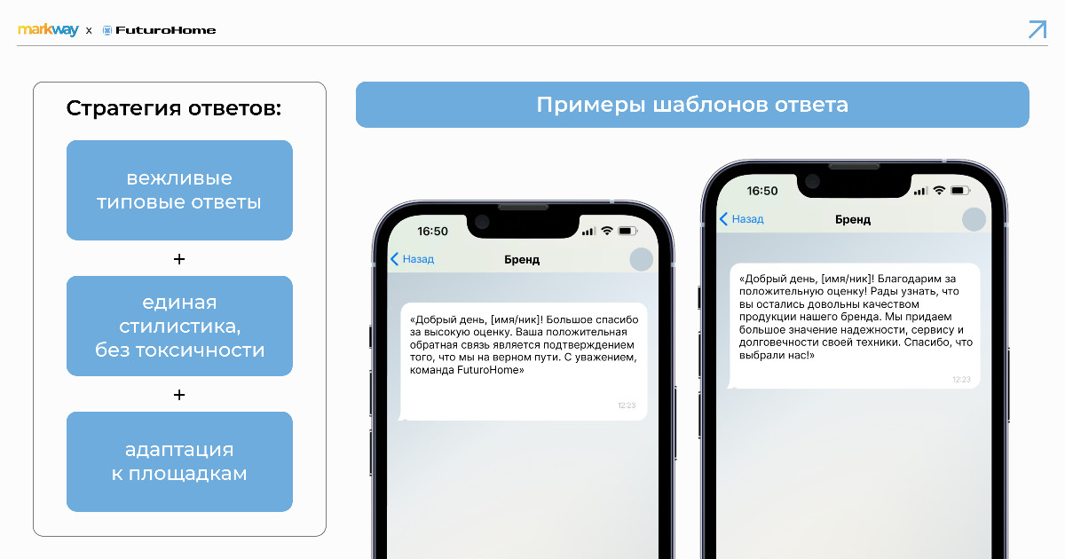 - Единая матрица шаблонов под сценарии (позитив/нейтраль/негатив) в рамках коммуникационной стратегии бренда.