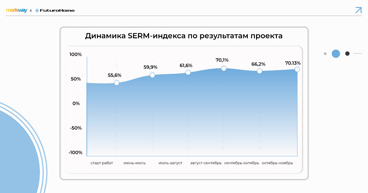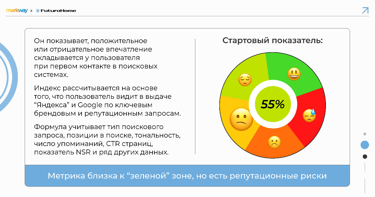 Проанализировали текущую ситуацию по клиенту, используя нашу собственную разработку — SERM-индекс. Эта комплексная метрика показывает, положительное или отрицательное впечатление складывается у пользователя при первом контакте в поисковых системах. На старте работы SERM-индекс держался на значении 55,6%. Это означает, что репутация с позитивным перевесом, но существуют риски. В выдаче индексировались только маркетплейсы и собственные ресурсы компании, по брендовому запросу “futurohome купить” интерес были невысоким.