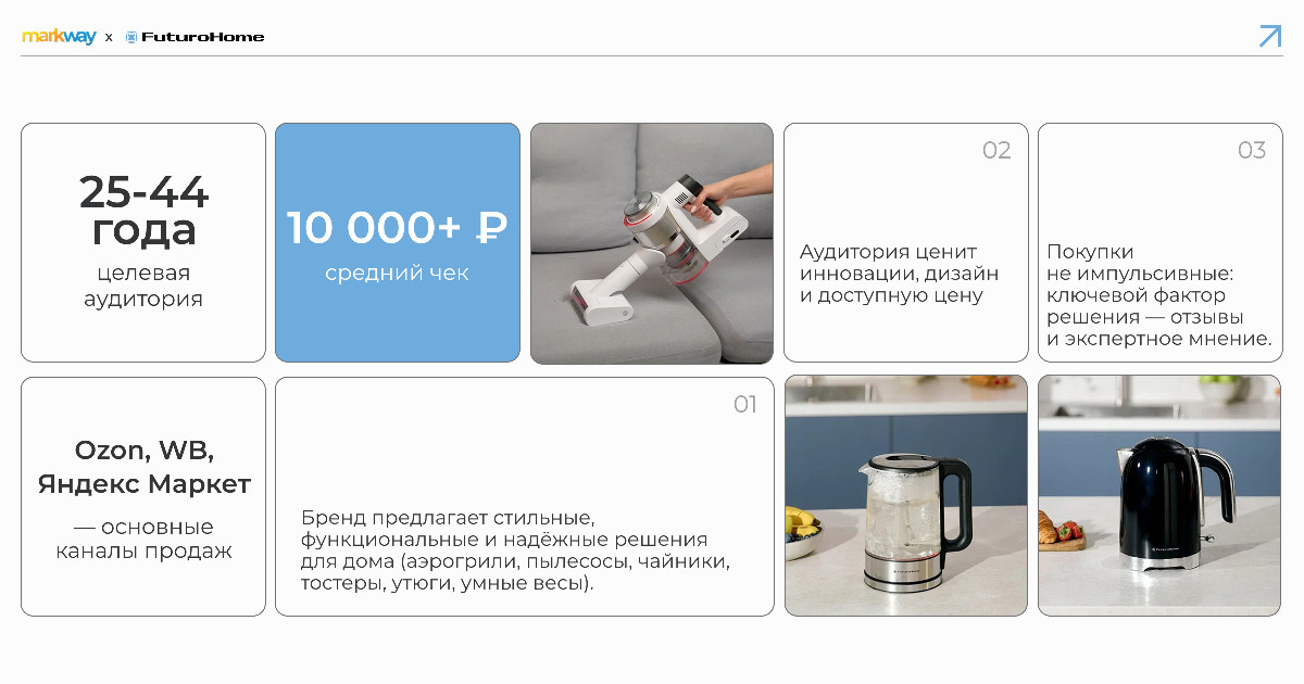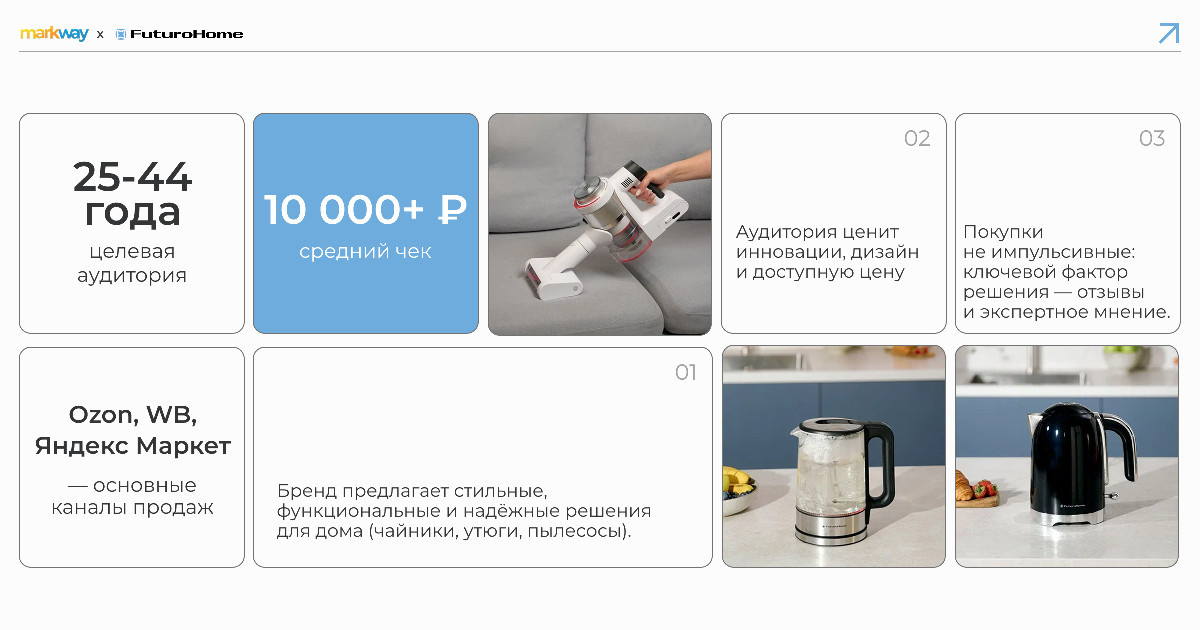Ключевые особенности бренда — молодая осознанная аудитория 25-44 лет, которая ценит инновации, стильный дизайн и доступную цену. Средний чек составляет чуть более 10 тысяч рублей. Среди каналов продаж преимущественно собственный сайт и популярные маркетплейсы: Ozon, Wildberries, “Яндекс Маркет”.