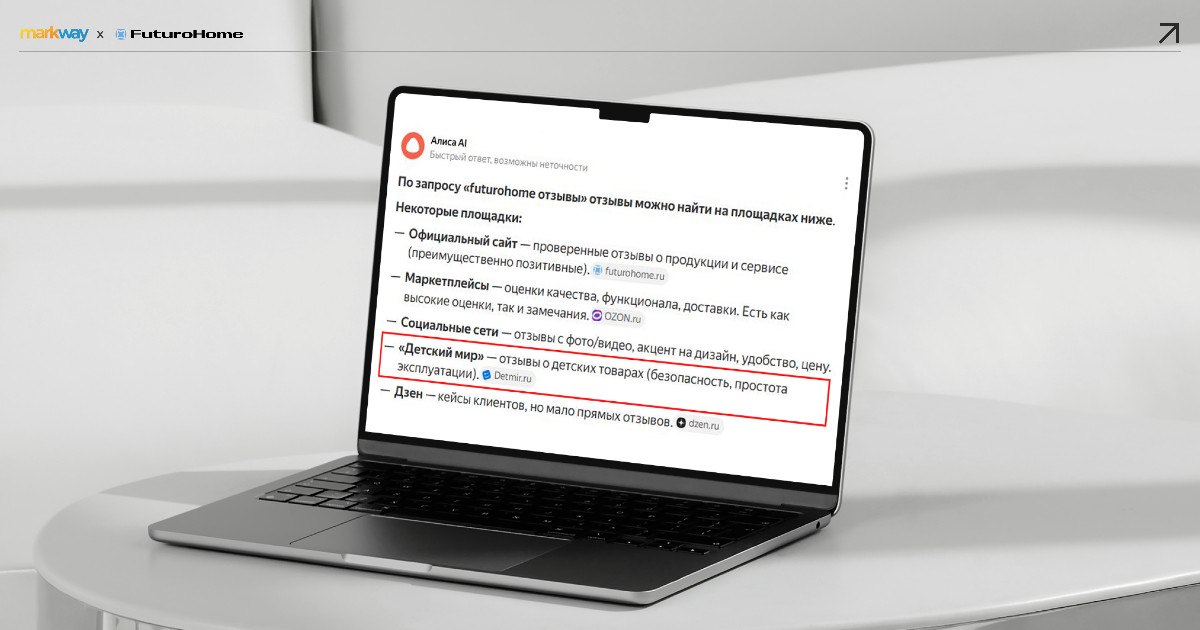 В ходе проекта мы дополнительно изучили, что о FuturoHome пишут нейросети. Как выяснилось, ассистент описывал бренд в целом, упоминая дизайн, доступную цену и удобство, но практически не давал детальной информации о пользовательском опыте. Случайным образом в ответ попал сайт “Детского мира”.