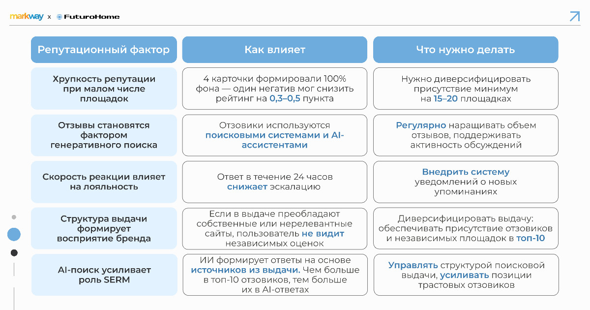 Кейс FuturoHome показал, что даже при отсутствии изначального цифрового следа можно сформировать устойчивую позитивную репутацию за 6 месяцев. Ключ к успеху — системность и присутствие на всех точках контакта с аудиторией.