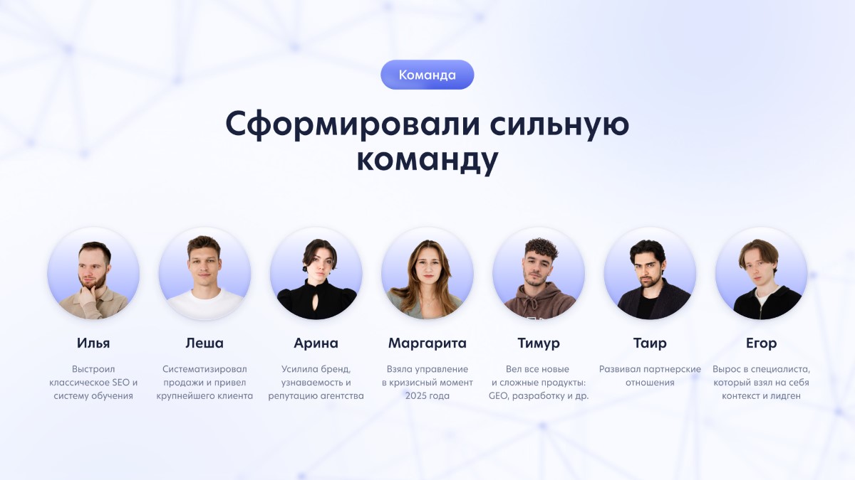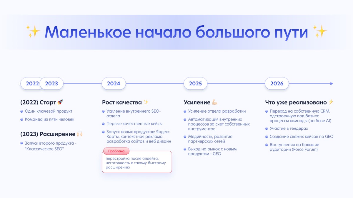 В 2022 году компания начиналась как небольшая команда из 5 человек с одним сильным и действительно уникальным на тот момент продуктом — направлением поведенческих факторов (быстрое seo). Старт был неплохой: 150+ клиентов и ещё больше желающих. Однако не каждому клиенту подходил продукт — без качественной seo-поддержки мы проигрывали рынку. Вот и первый урок.