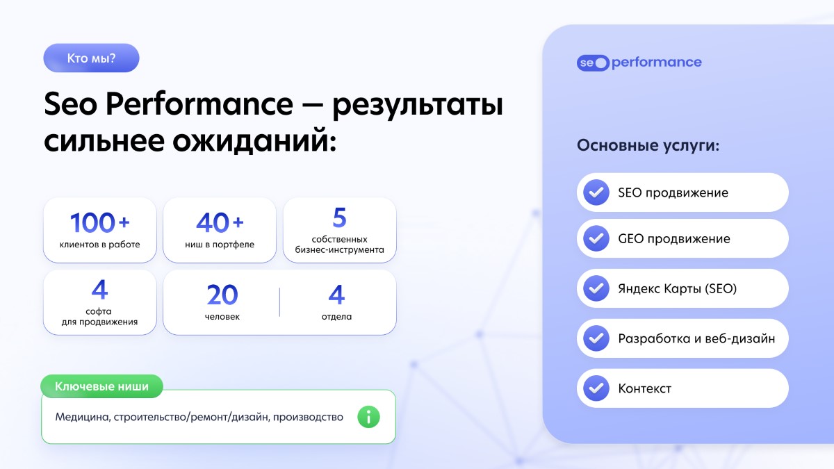 SEO Performance Agency — независимое digital-агентство нового поколения, выросшее из узкой SEO-экспертизы в системного performance-партнера для бизнеса. Мы трудимся на стыке классического SEO, разработки, аналитики, гео-продвижения, и, теперь уже, GEO/AEO и разных AI-инструментов — помогаем компаниям выстраивать управляемый рост из поиска и смежных digital-каналов.