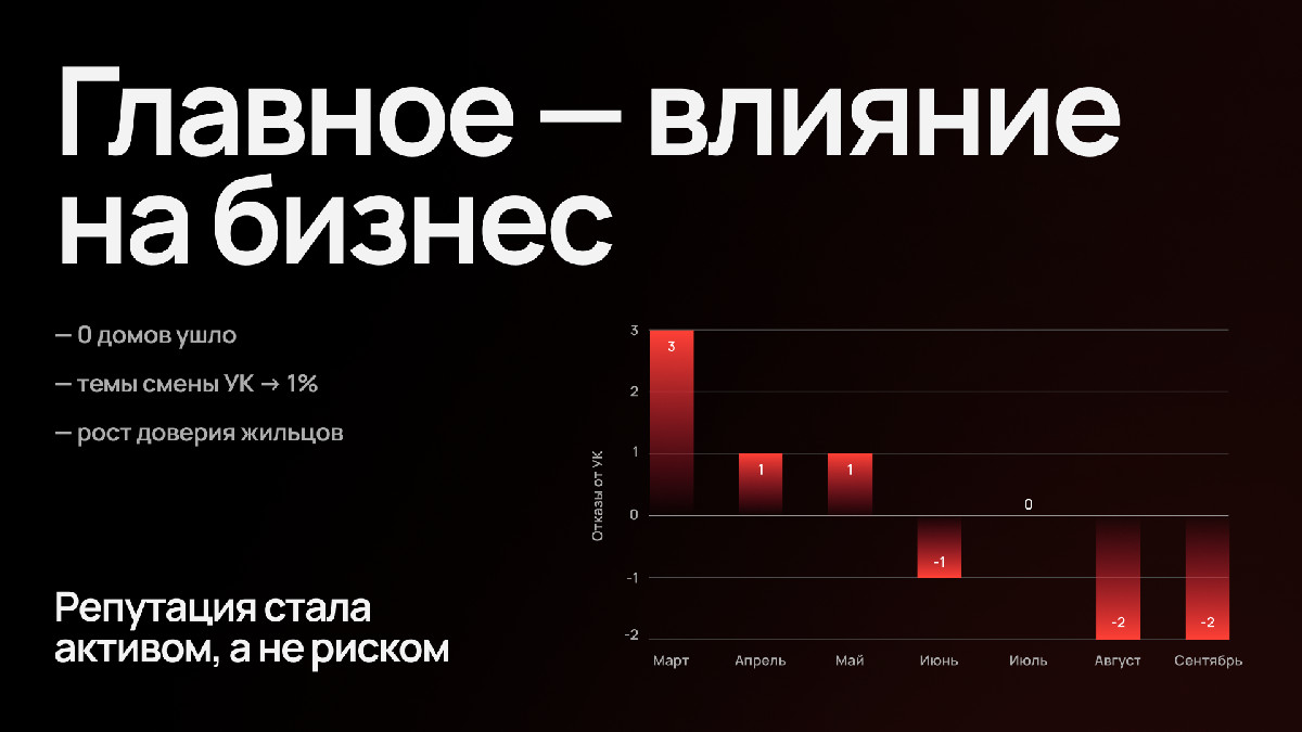 компания сохранила весь портфель домов, снизила давление со стороны негатива и вернула доверие жителей.