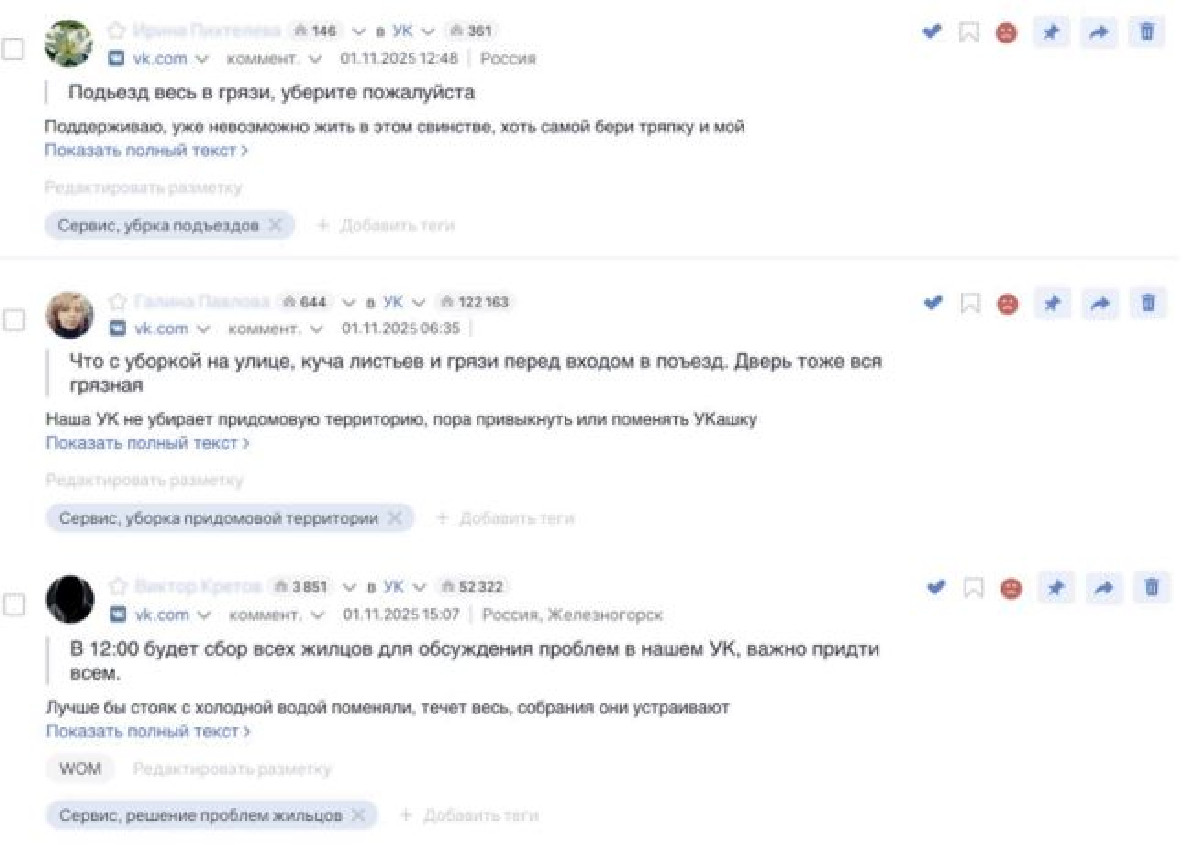 Следующий шаг — выстраивание операционной модели работы с обращениями. Мы нашли более 120 чатов и сообществ жильцов, включая закрытые группы, куда ранее у УК не было доступа. Во все площадки добавили официальные аккаунты компании и закрепили за ними модераторов.