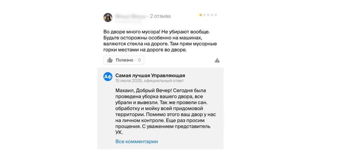 В результате проекта управляющая компания перешла от неконтролируемого репутационного поля к управляемой системе коммуникации с жильцами, где каждое обращение обрабатывается, а каждый негатив — становится точкой роста, а не риском.