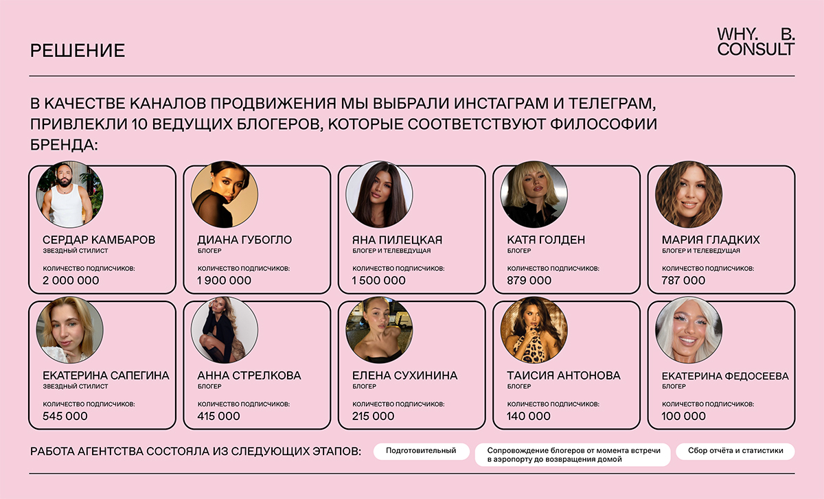 Мы благодарны команде WHYBCONSULT за помощь в сопровождении инфлюенсеров и координации коммуникации на протяжении всей поездки. Благодаря совместной работе нам удалось создать действительно яркий опыт для участников.