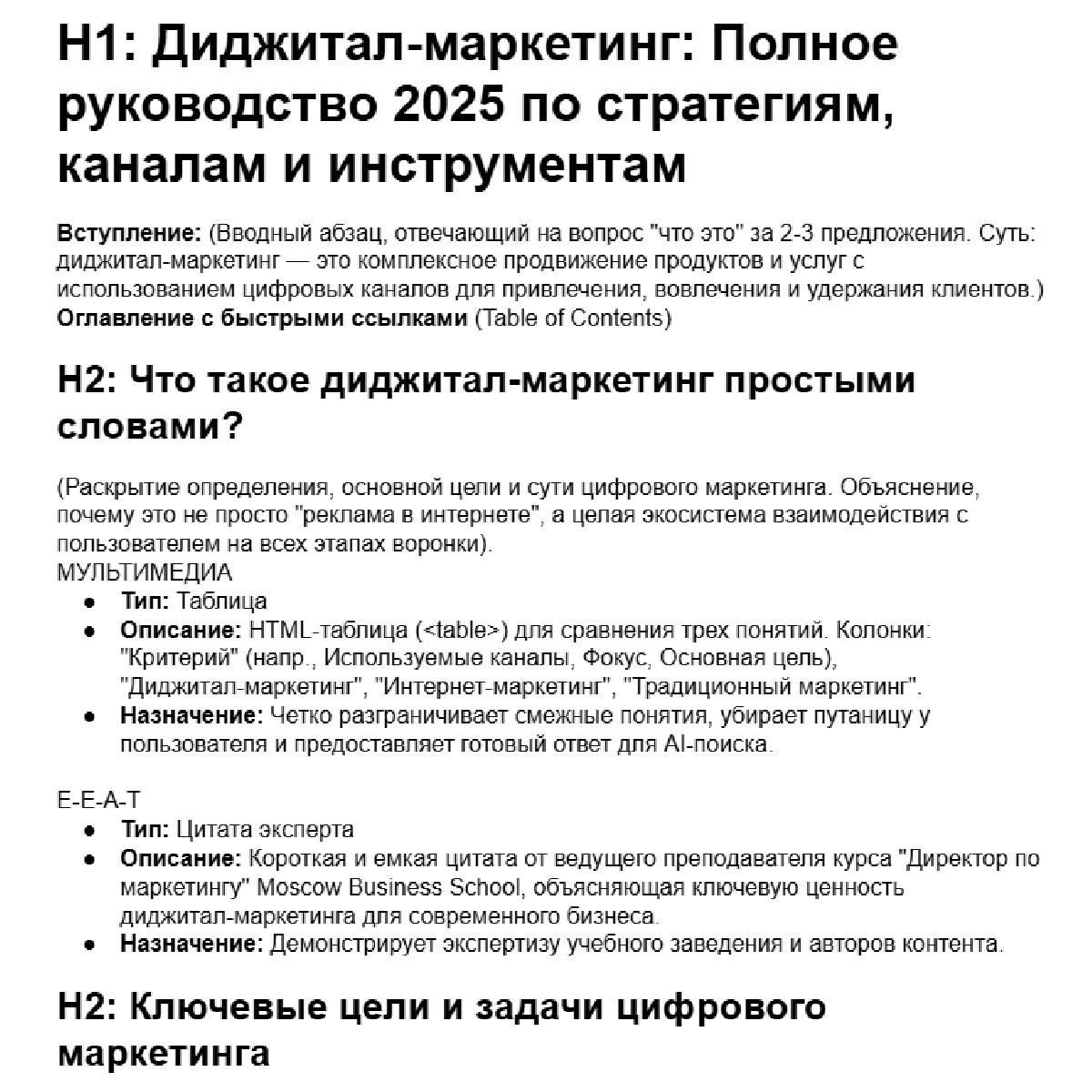 Для высокочастотных (ВЧ) запросов ИИ формирует детальную структуру статьи, которая дорабатывается редактором и экспертом