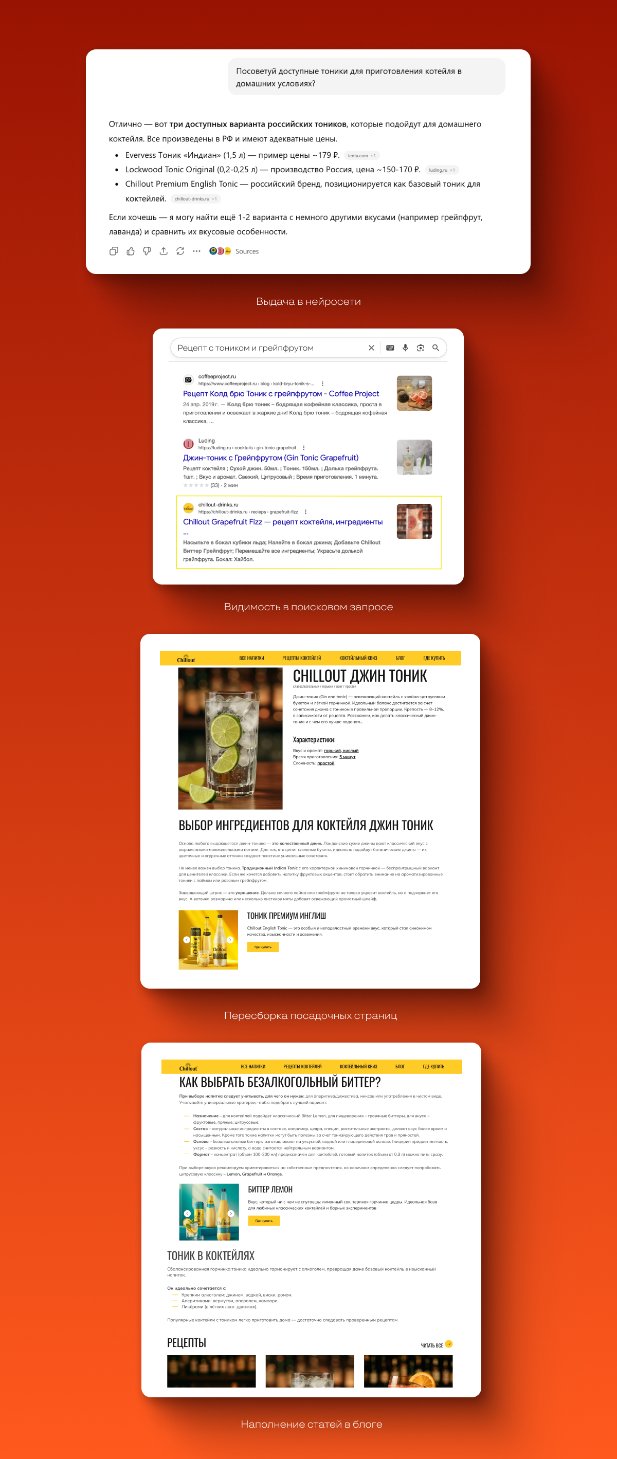 Для страниц с рецептами коктейлей мы создали подробную структуру блоков, которая позволила улучшить ранжирование и выдачу в нейроответах. Мы внедрили: описание, характеристики, ингредиенты, аксессуары (барный инвентарь), пищевая ценность, гайды по выбору ингредиентов и сочетания пропорций, товарный виджет, пошаговая инструкция, советы по подаче и блок FAQ.