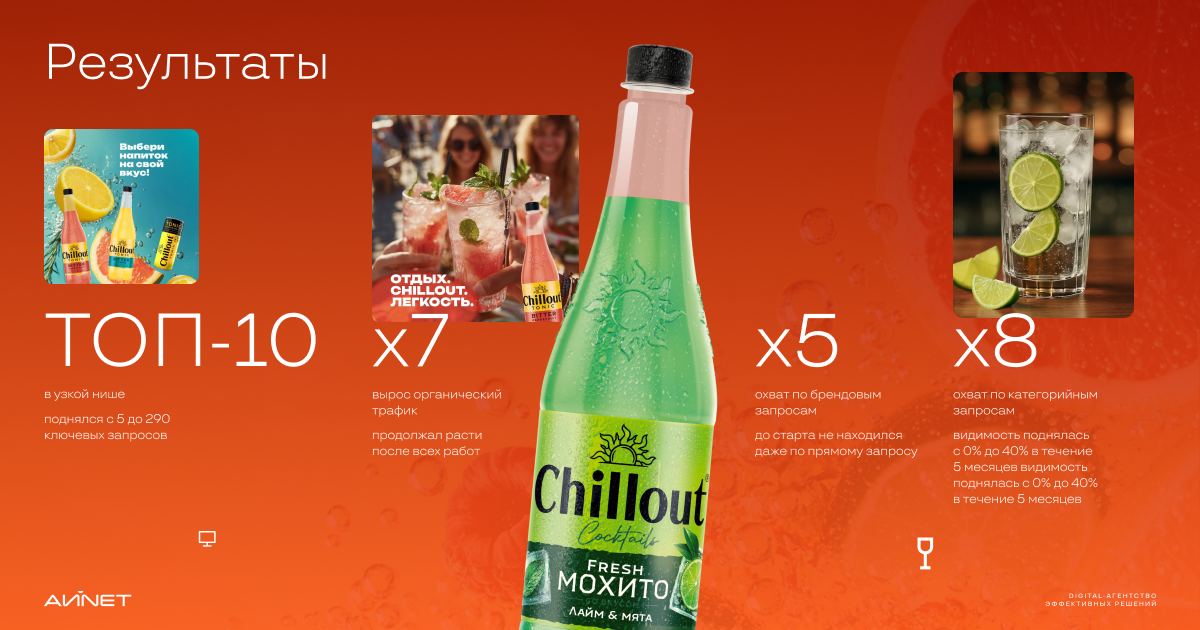 По итогам проекта Chillout стал ассоциироваться с популярными коктейлями и в органическом поиске, и в AI-ответах. Это дало реальное расширение охвата и закрепление знания о продукте в сознании аудитории.