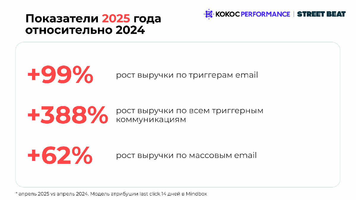 - +99% — рост выручки по триггерным email-рассылкам;