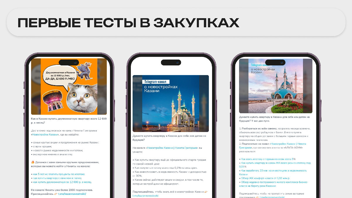 Когда мы только начинали, Telegram ADS ещё не работал, и основной трафик мы привлекали через посевы. Первыми каналами стали новостные и лайфстайл-паблики Казани — посты с узнаваемыми местами города и мемами показали лучшие результаты. Это позволяло привлекать подписчиков по 30 рублей — по сегодняшним меркам это кажется невероятным.