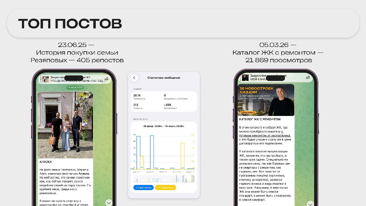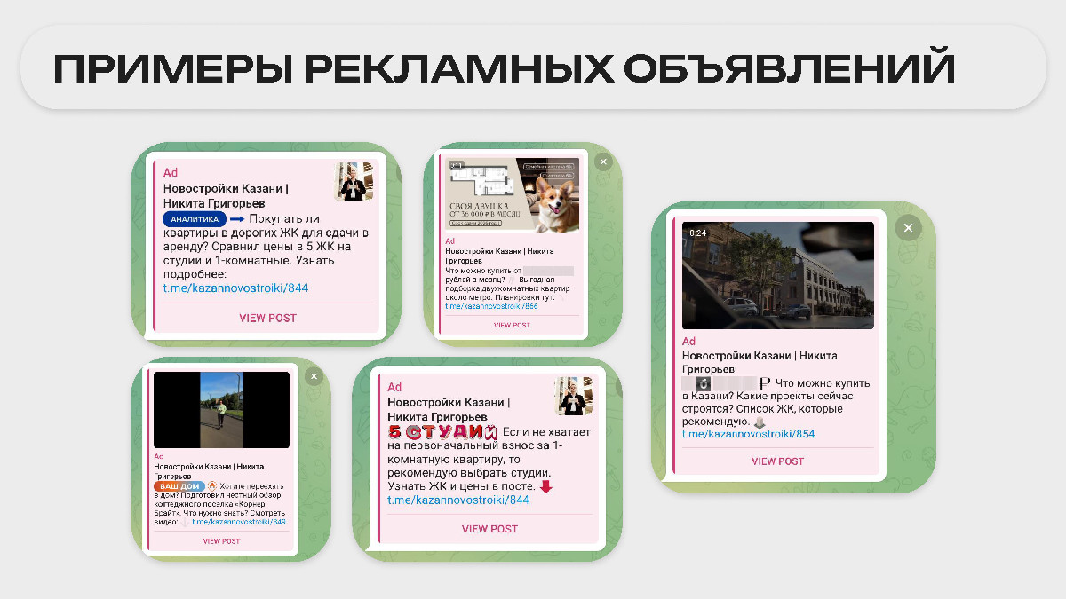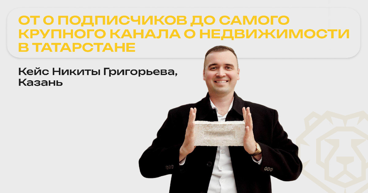 Никита Григорьев, риелтор из Казани, впервые обратился к нам весной 2022 года. На то момент у него было 0 подписчиков. За 4 года работы с нами он вырос до автора самого крупного канала о недвижимости в Татарстане https://t.me/kazannovostroiki