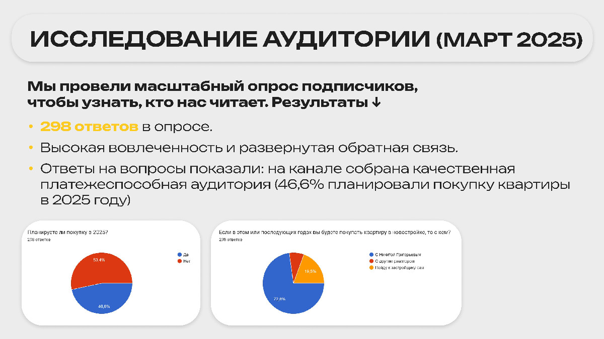 - Ответы на вопросы показали: на канале собрана качественная платежеспособная аудитория (46,6% планировали покупку квартиры в 2025 году).