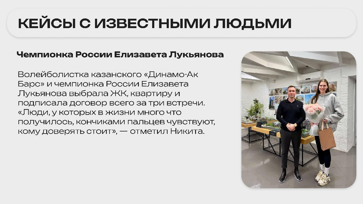 Волейболистка казанского «Динамо-Ак Барс» и чемпионка России Елизавета Лукьянова выбрала ЖК, квартиру и подписала договор всего за три встречи. «Люди, у которых в жизни много что получилось, кончиками пальцев чувствуют, кому доверять стоит», — отметил Никита.