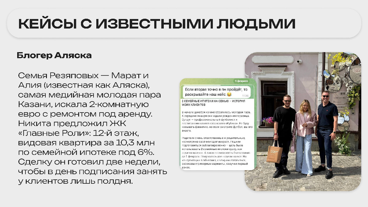 Семья Резяповых — Марат и Алия (известная как Аляска), самая медийная молодая пара Казани, искала 2-комнатную евро с ремонтом под аренду. Никита предложил ЖК «Главные Роли»: 12-й этаж, видовая квартира за 10,3 млн по семейной ипотеке под 6%. Сделку он готовил две недели, чтобы в день подписания занять у клиентов лишь полдня.