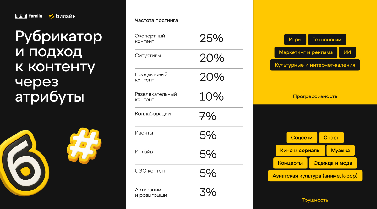 Вторичные, но регулярные рубрики включают развлекательные форматы, продуктовый контент, ивенты, инлайв, UGC и активации с розыгрышами. Структура обеспечила баланс между актуальностью, экспертностью и нативной вовлеченностью аудитории.