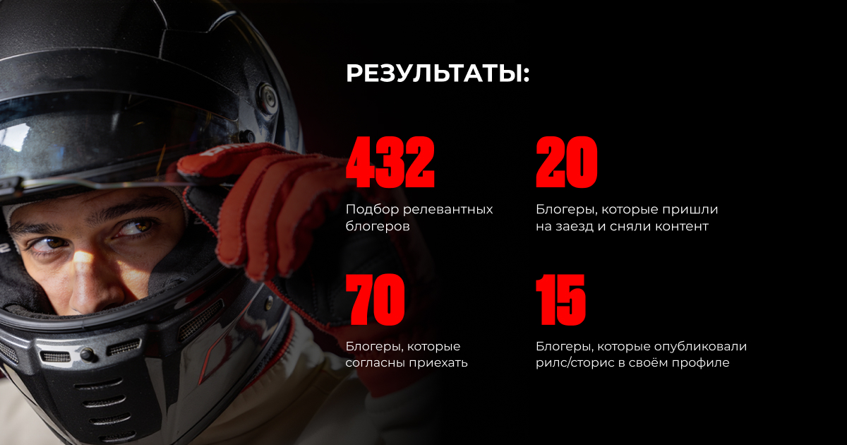 Системная работа с микро- и наноблогерами. Мы доказали: большие охваты и вовлечённость можно получать без огромных бюджетов. Строим воронки подбора, делаем ставку на бартер — и это работает. Для брендов с небольшим бюджетом это открывает двери в инфлюенс-маркетинг. Интеграции с бартерными блогерами для картинг-клуба увеличили выручку в 2 раза — и это без рекламного бюджета.