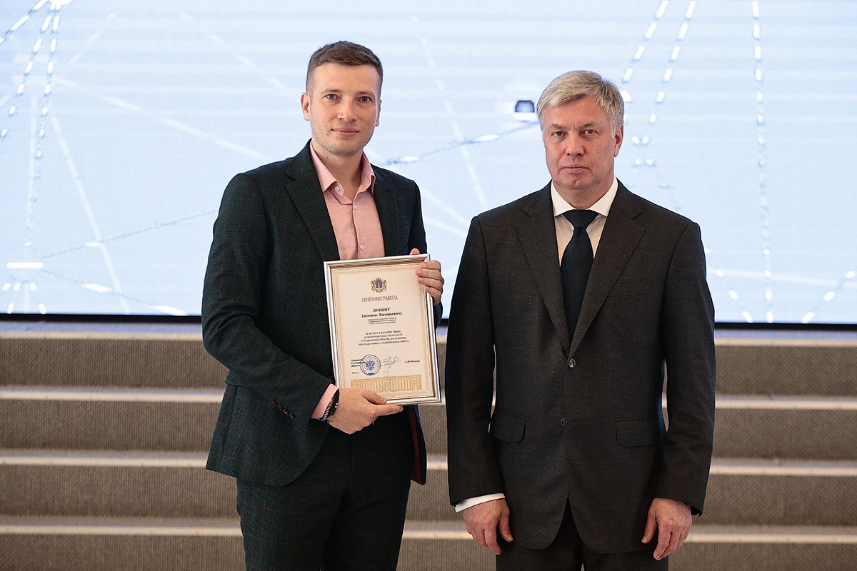 Награждение Почетной грамотой "За заслуги в развитии сферы информационных технологий в Ульяновской области, достигнутые трудовые успехи и плодотворную работу" лично Губернатором Ульяновской области Алексеем Русских
