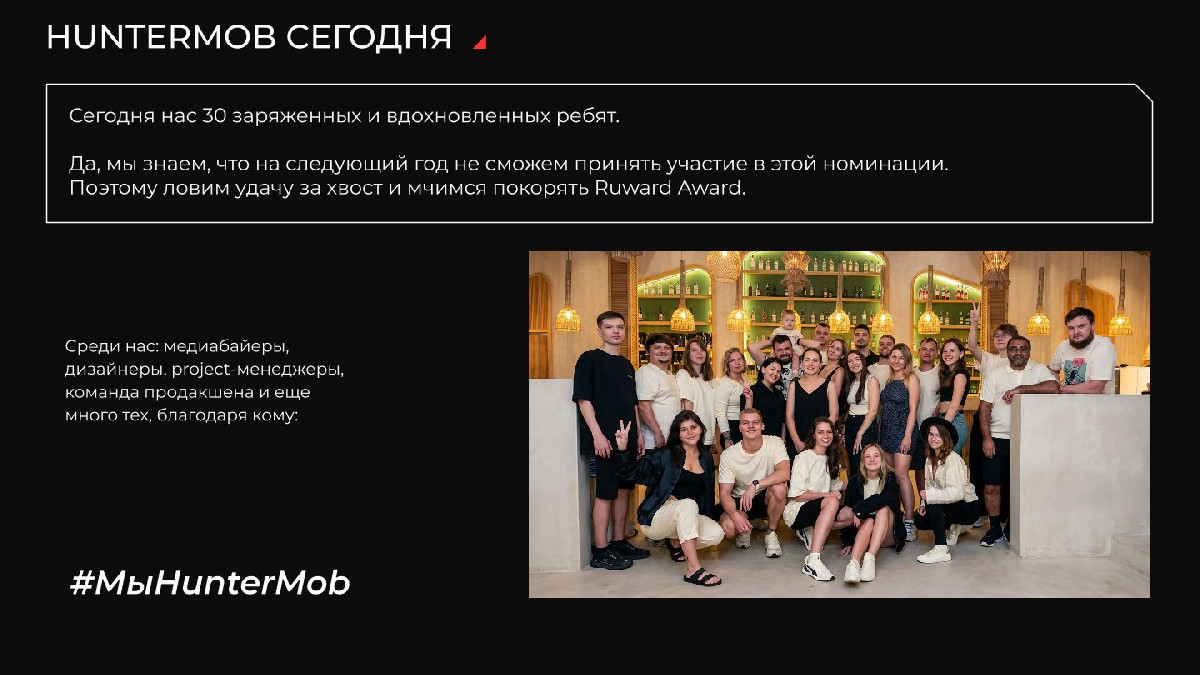 В современном мире креатив — это не просто визуал, а 80% успеха рекламной кампании. Именно поэтому этот этап биографии HunterMob будет ценен бизнесу, который хочет быть в центре внимания.