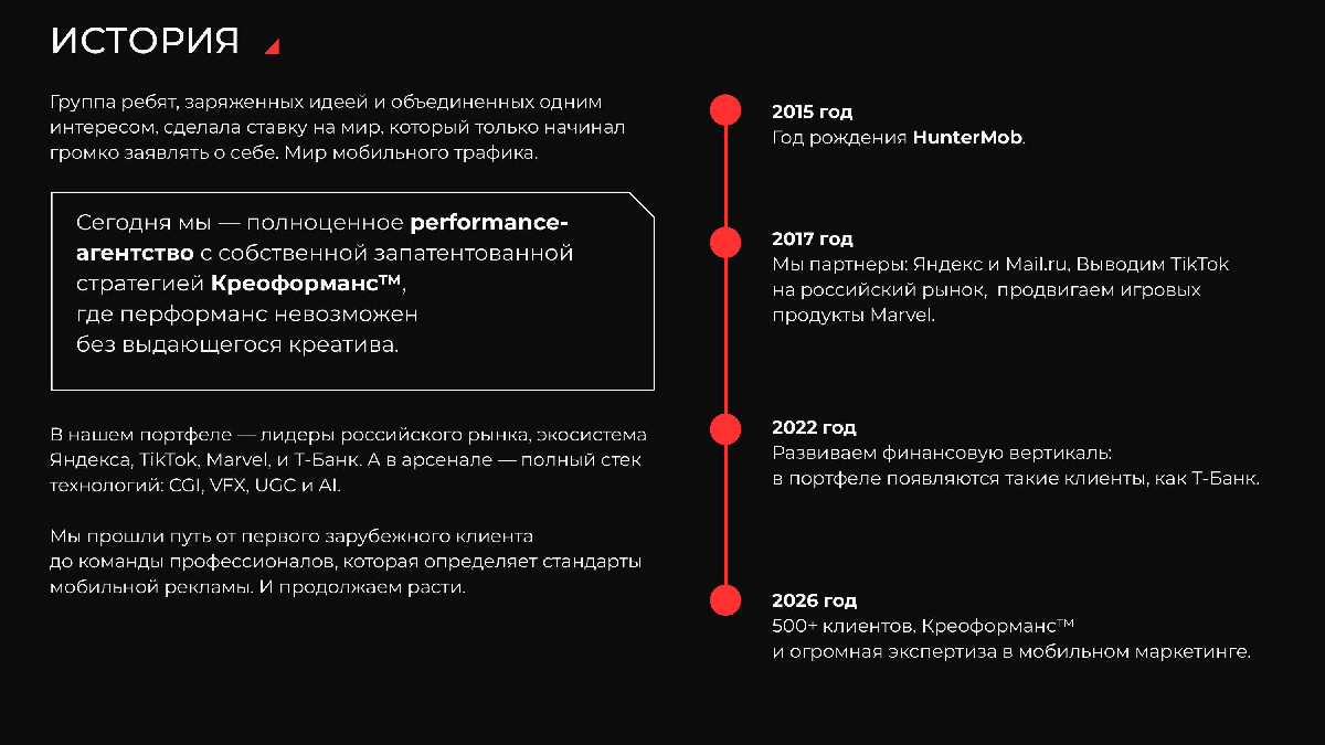 Мы прошли через все вертикали, освоили performance-маркетинг на уровне прикладной экспертизы, а не просто теории. Сегодня мы не догоняем тренды, а работаем на опережение. Потому что для HunterMob важно дать клиенту не просто удочку, а эффективное решение, которое действительно работает здесь и сейчас.