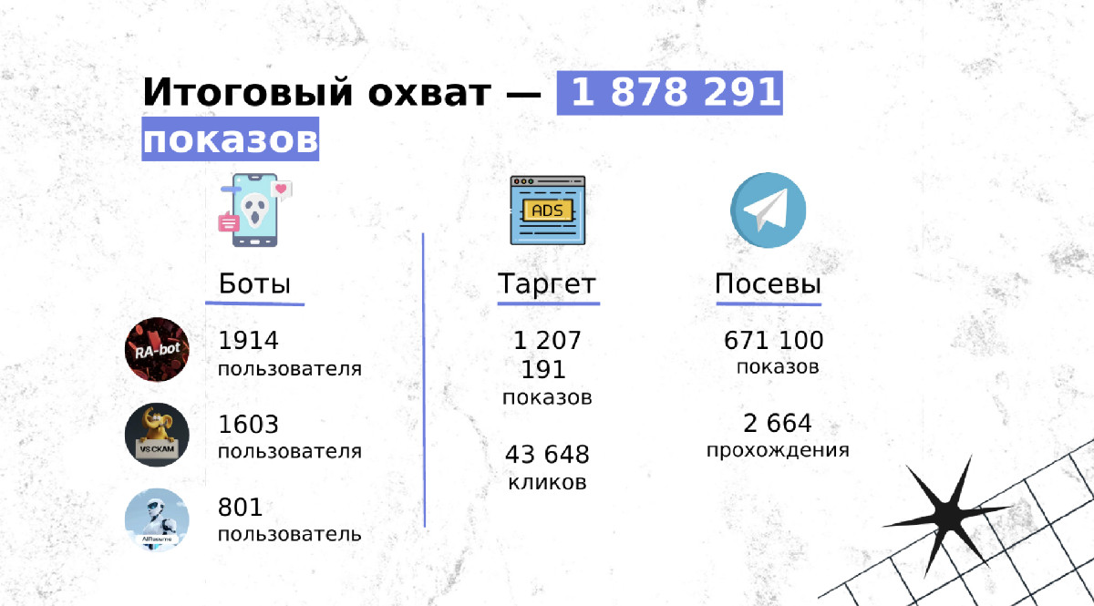 Баннеры вели на лендинг, созданный специально для продвижения проекта, как социальной рекламы. Сайт помог аудитории осознать серьезность рисков и привел на официальный TG-бот.