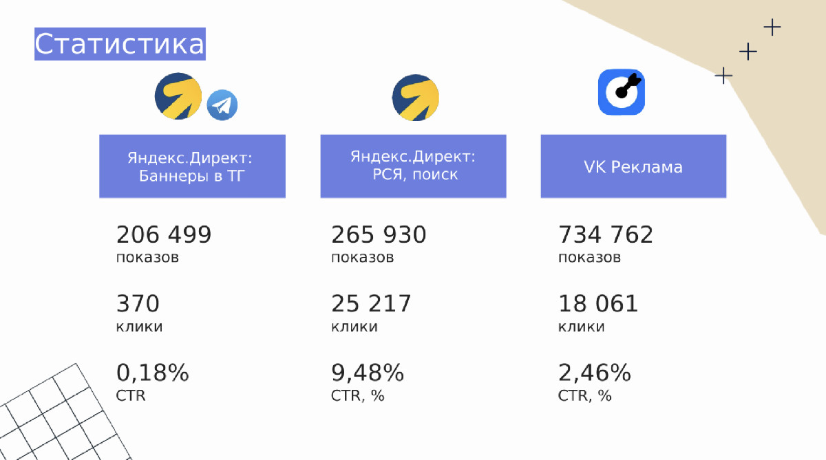 1) Данного результата удалось достигнуть за счет высокого CTR - 9.48% в Яндексе с показами в РСЯ и 2.46% в VK Рекламе.