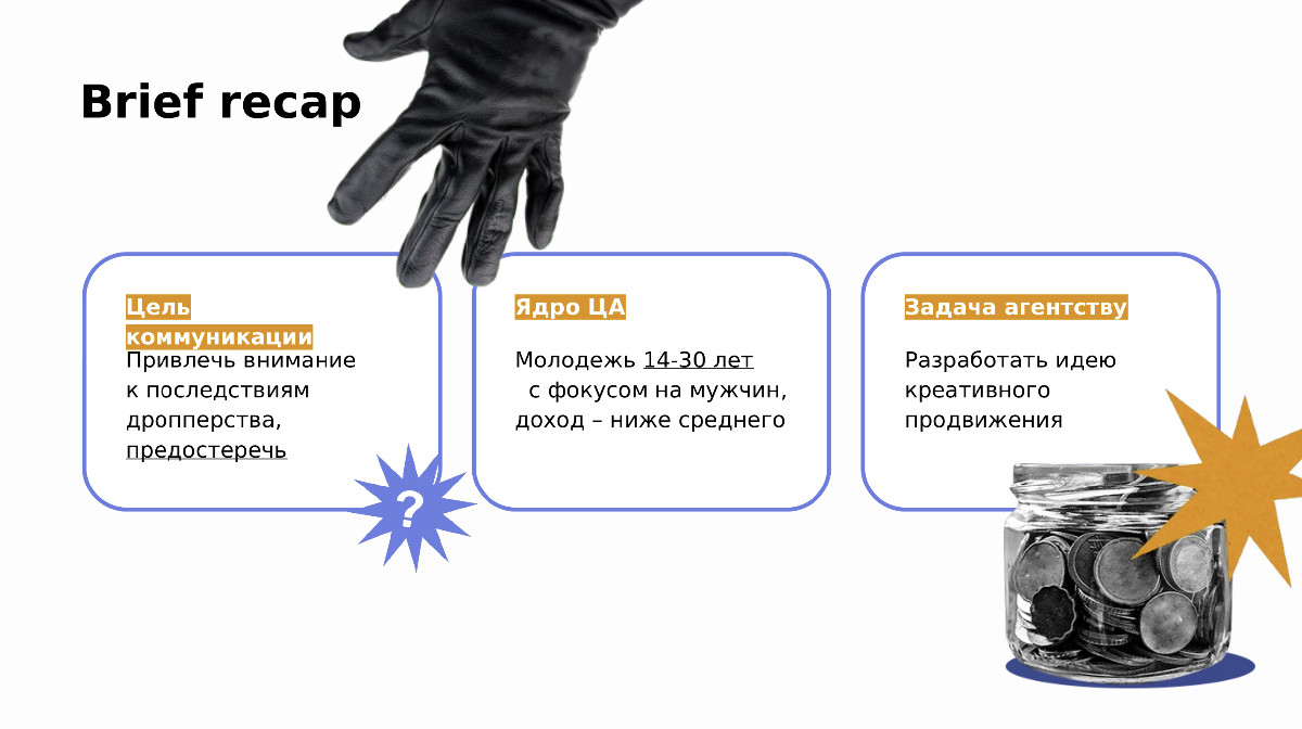 Нашей задачей было привлечь внимание к теме дропперства и последствиям среди молодой аудитории, с помощью креативного спецпроекта и продвижения. Создать виральный эффект: Запустить проект, который вызовет активное обсуждение в соцсетях и СМИ, привлекая внимание к скрытой угрозе.