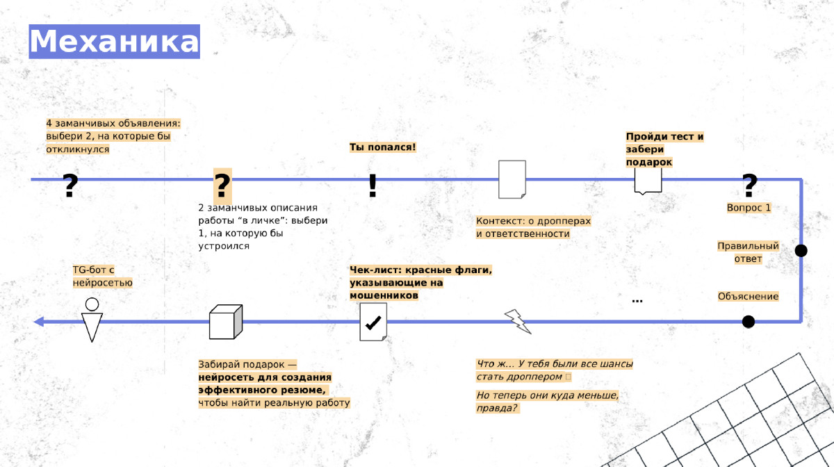 На первых трех шагах мы работали с одной целью: вовлечь и дать пользователю ощущение безопасности. С четвертого шага "Контекст: о дропперах и ответственности" мы начинали свою образовательную деятельность.