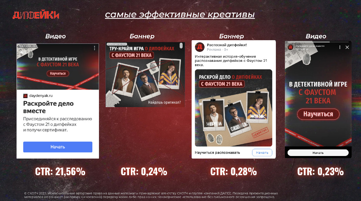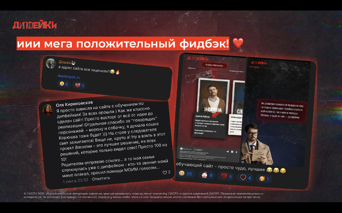 3) Нам было важно, чтобы пользователь, попадая на лендинг, сразу вовлекался в игру. Так, на главной странице его встречал первый сюжетообразующий интерактив – выбор главного героя. Сайт проекта: https://daydenyak.ru/sacrifice.html. За успешное прохождение обучения пользователи получали именной сертификат, а также удобные чек-листы для проверки на видео и аудио на дипфейк!