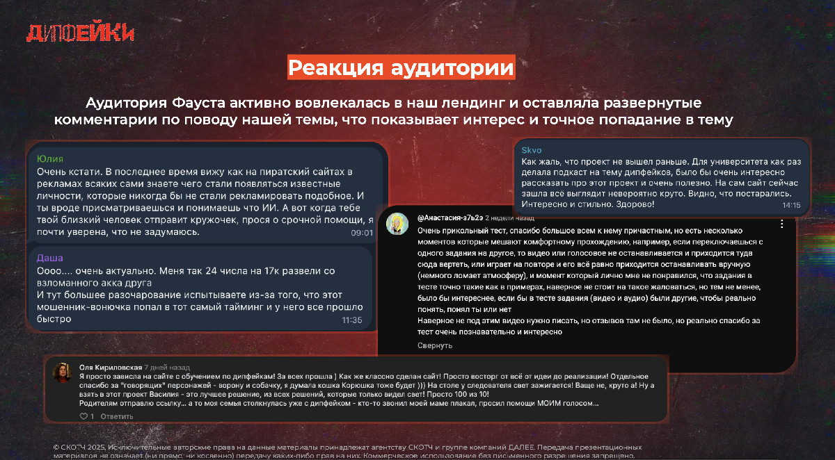 3) Социальный вклад: Проект для «Финансовой культуры» — важный шаг в защите финансового благополучия граждан. Мы доказали, что профилактика мошенничества может быть захватывающей, модной и эффективной. Создали супер стилевый и бессмертный гайд