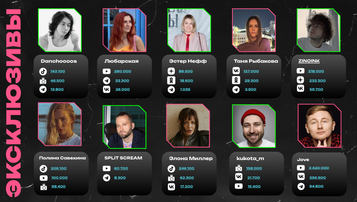 - Эксклюзивный пул: Собственный юнит по работе с креаторами, включающий 20 топовых эксклюзивных блогеров с суммарным охватом более 8 млн подписчиков.