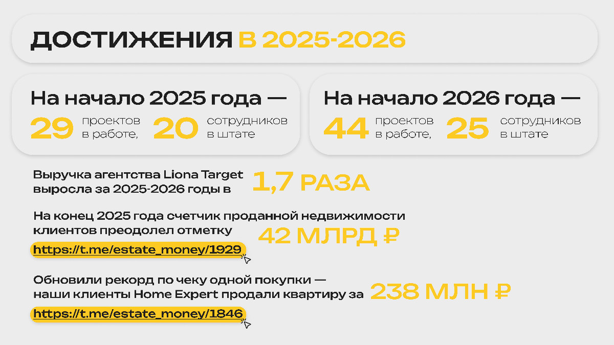 2025–2026 годы стали одними из тяжелейших для рынка недвижимости. В этих условиях агентство не просто выжило — оно выросло: 29 → 44 проекта, выручка ×1,7, счётчик проданной недвижимости пробил отметку 42 млрд рублей.