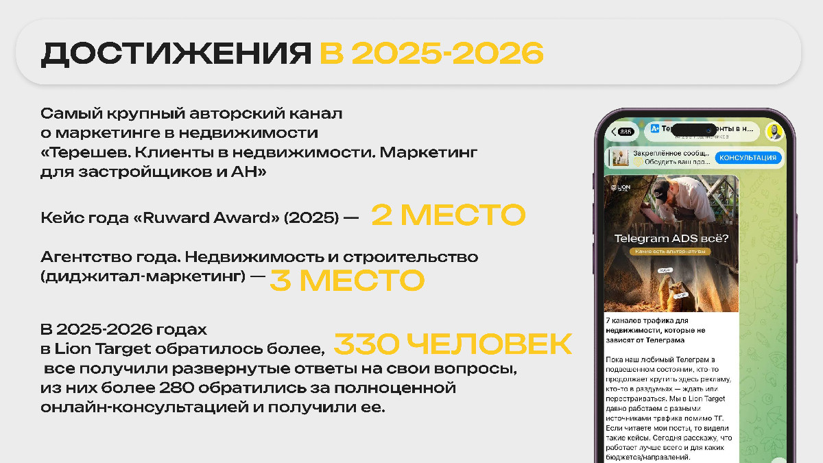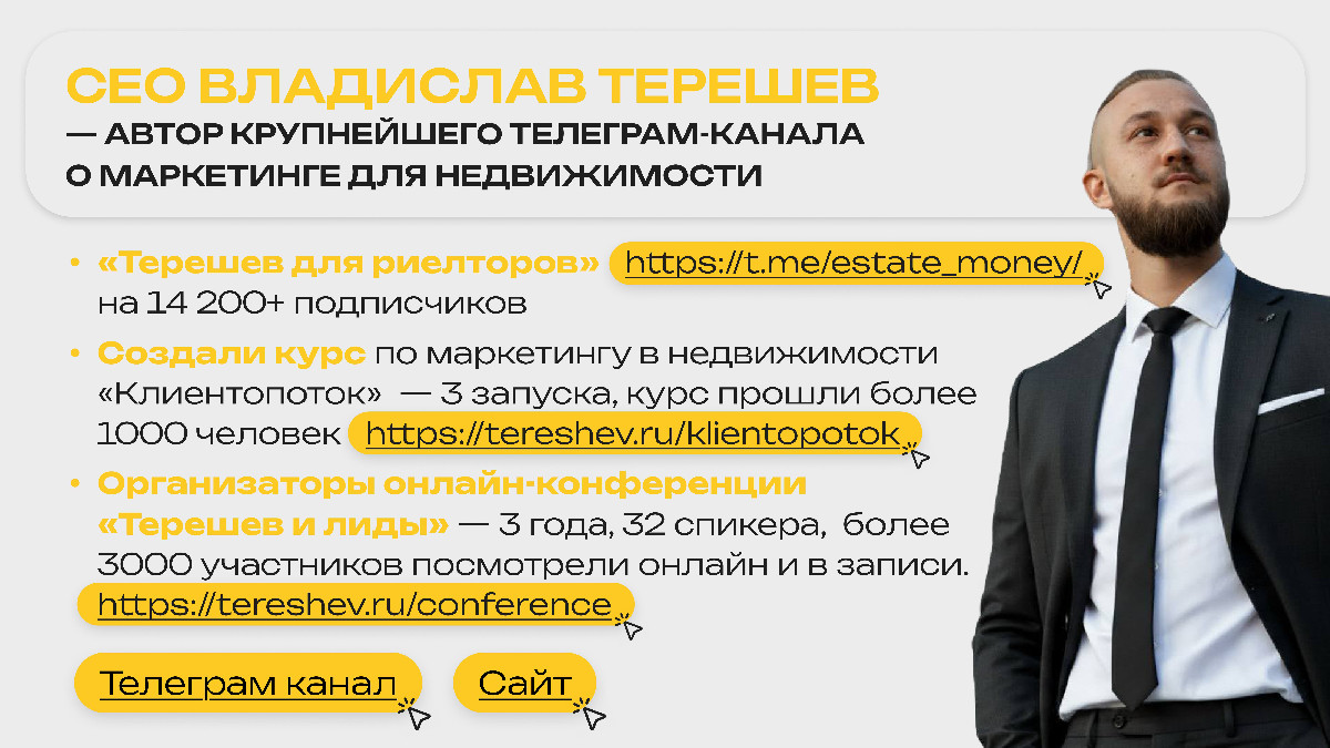 - СЕО Владислав Терешев — автор крупнейшего Телеграм-канала о маркетинге для недвижимости «Терешев для риелторов» на 14 200+ подписчиков.