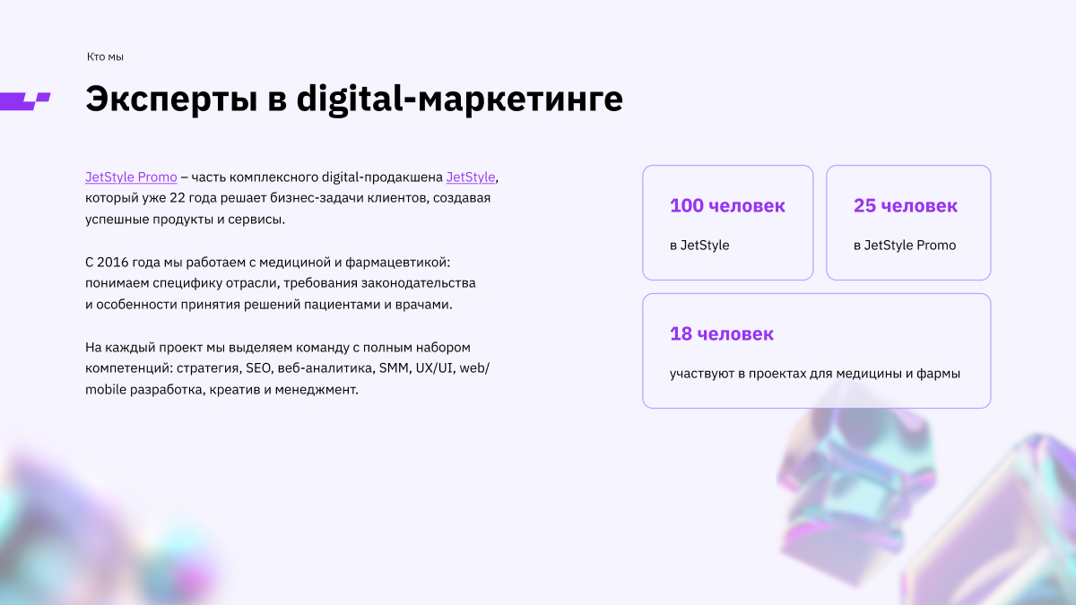 В JetStyle 100 человек, в JetStyle Promo — 25. Из них 18 участвуют в проектах для медицины и фармы