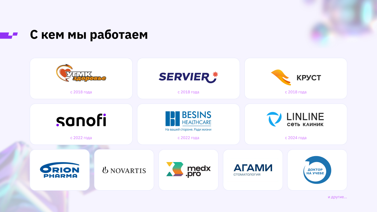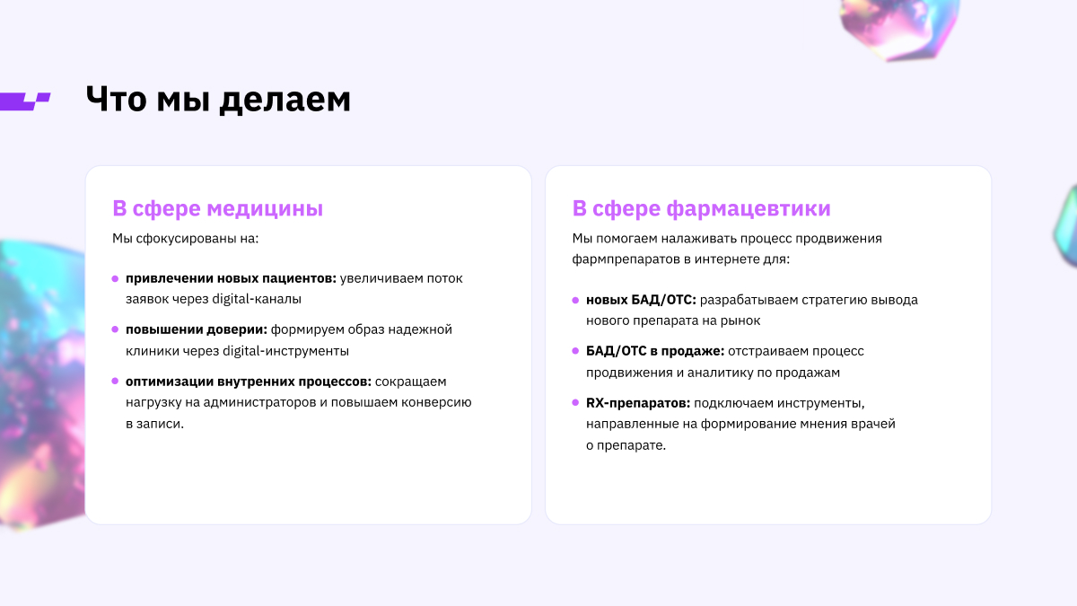 С 2016 года мы работаем с медициной и фармацевтикой: понимаем специфику отрасли, требования законодательства и особенности принятия решений пациентами и врачами.