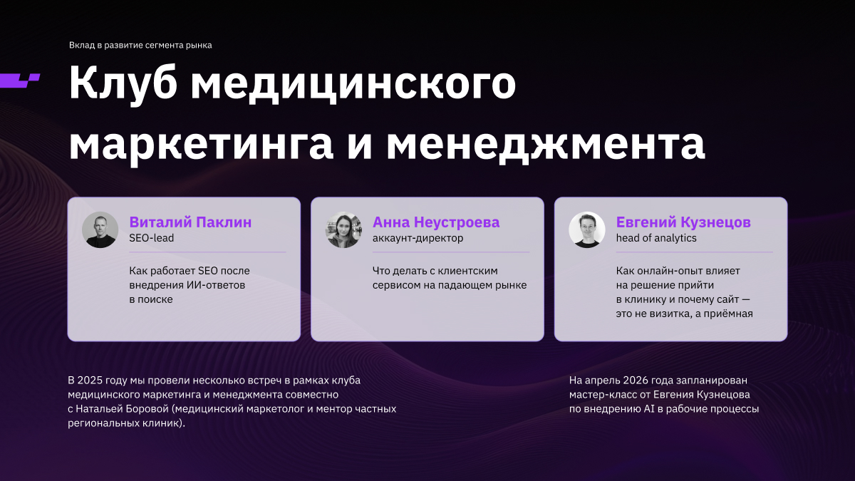 Мы не ограничиваемся работой с клиентами. В 2025 году мы активно участвовали в жизни медицинского маркетингового сообщества — делились экспертизой, помогали рынку разобраться в новых реалиях.