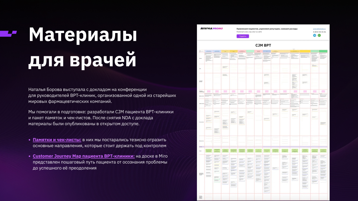 Мы помогали в подготовке: разработали CJM пациента ВРТ-клиники и пакет памяток и чек-листов. После снятия NDA с доклада материалы были опубликованы в открытом доступе.