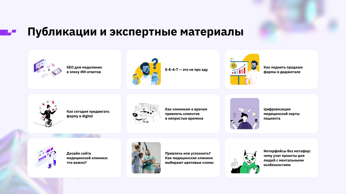 Медицина и фармацевтика для нас — направление, которое мы целенаправленно развиваем с 2016 года: изучаем специфику продвижения YMYL-контента, работаем в условиях жёстких законодательных ограничений, понимаем логику принятия решений пациента и разбираемся, чем отличается путь пациента в частной клинике от пути покупателя в онлайн-аптеке.