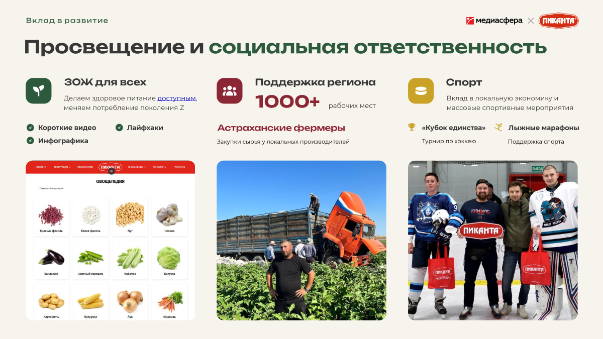 Бренд вкладывается в развитие региональной аграрной базы, поддерживает спорт на местах и участвует в жизни местных сообществ. На первый взгляд простая еда — это реальное производство, российское сырьё и более тысячи рабочих мест в регионе.