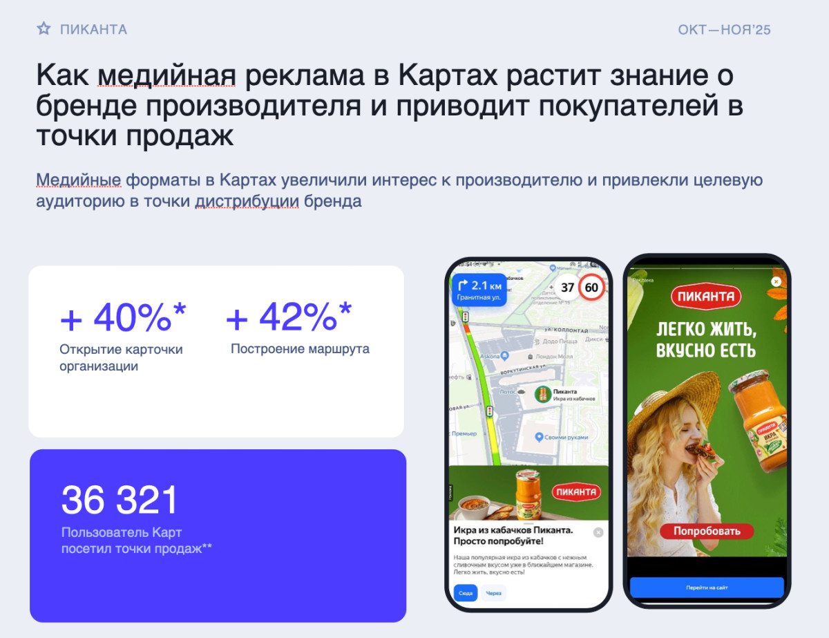 Яндекс ПромоСтраницы — формат статей, который вызывает интерес к продукту. Для «Пиканта» были созданы материалы о рецептах, сценариях потребления, пользе продуктов — и аудитория читала их. По‑настоящему. Десятки и сотни тысяч прочтений по каждой теме. Стоимость клика оказалась в 2,5 раза ниже среднего по категории, а количество переходов превысило прогноз в 12 раз (итого 570 000 переходов на сайт бренда).