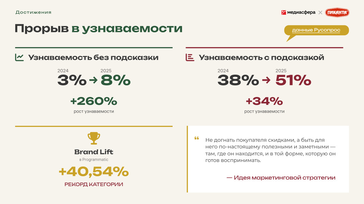 «Пиканта» — это образец того, каким должен быть современный российский заказчик: смелым, измеримым, партнёрским и результативным. Это не просто успешный кейс. Это новый стандарт взаимодействия бренда и агентства в эпоху, когда побеждают не бюджетом, а смелостью и точностью.