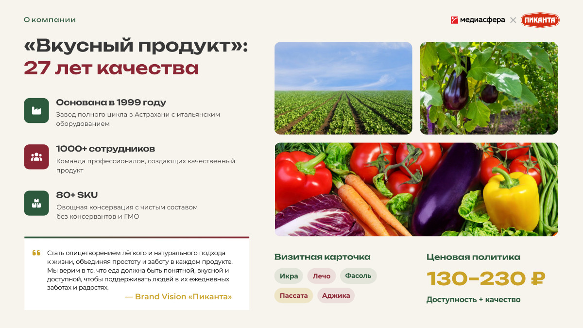 Компания основана в 1999 году в Астрахани. Сегодня в штате — свыше 1000 сотрудников, в основе производства — собственный завод полного цикла. За 27 лет работы «Пиканта» выстроила широкую линейку продуктов: овощные икры, лечо, фасоль, закуски с баклажанами, пассата, кетчупы и соусы для пасты. Всё — из натурального сырья, с понятным составом. Коммуникационная формула бренда: «Легко жить, вкусно есть».