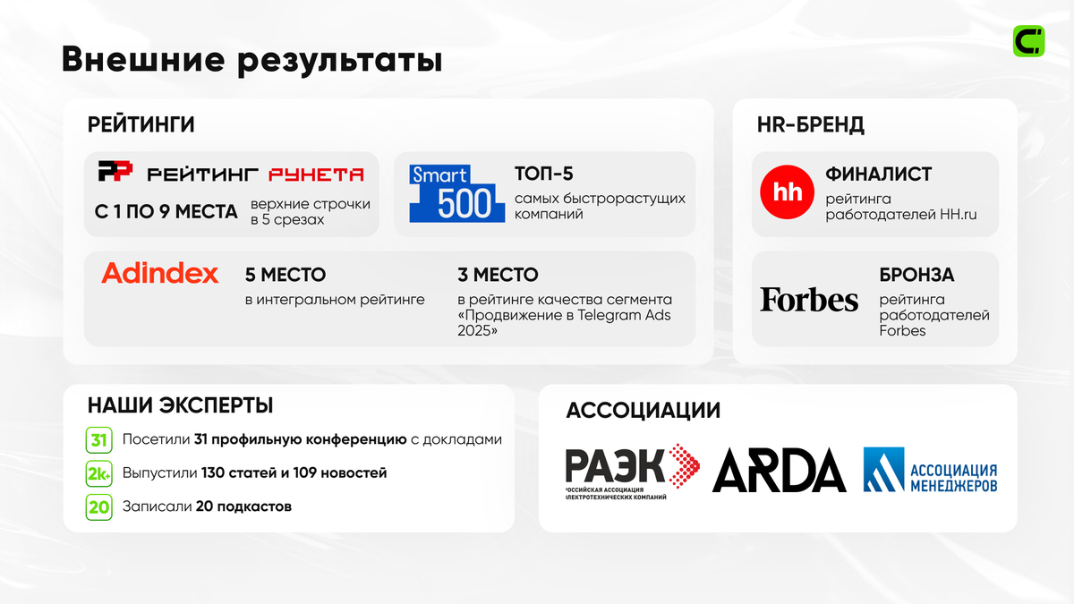 Побеждаем в рейтингах: Рейтинг Рунета, Smart 500, AdIndex, вошли в топ-20 работодателей по версии hh.ru, стали бронзовым призером рейтинга лучших работодателей Forbes Россия.