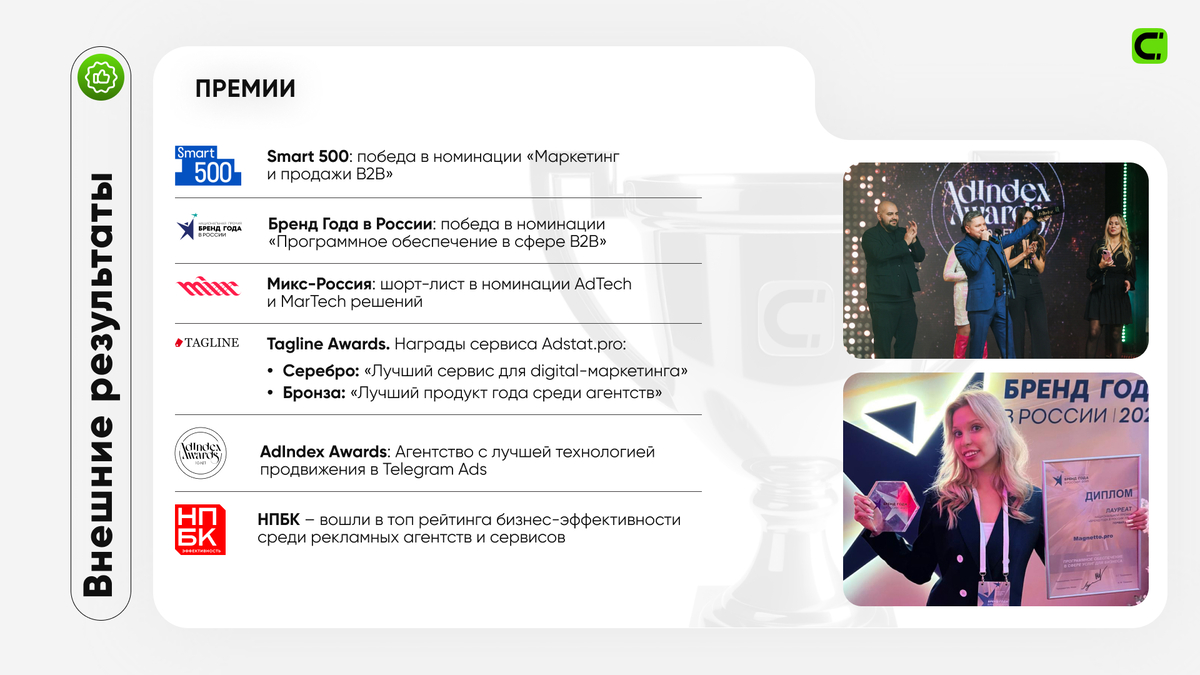 Занимаем призовые места на премиях: Smart 500, Бренд года в России, Микс-Россия, Tagline Awards, AdIndex Awards, CX Worlds Awards, Team Awards.