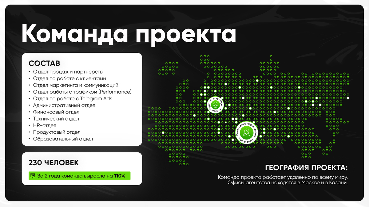 Сотрудники работают в Москве, Казани и более чем 10 других городах, включая удаленные позиции. География расширялась параллельно с систематизацией процессов — от найма до обучения и управления эффективностью.