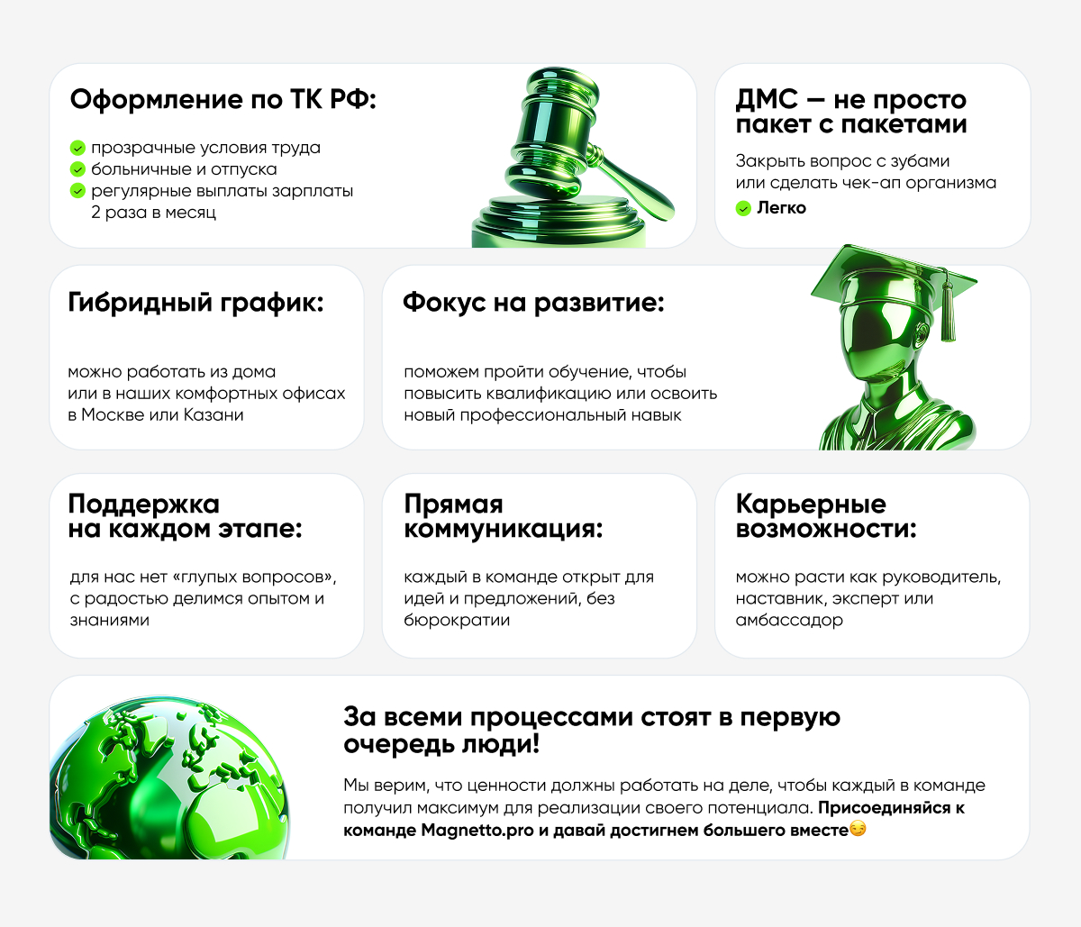 Особое внимание уделяется адаптации новых сотрудников. В компании действует структурированная система онбординга, которая помогает быстрее погрузиться в рабочие процессы, познакомиться с миссией и ценностями Magnetto.pro и почувствовать себя частью команды.