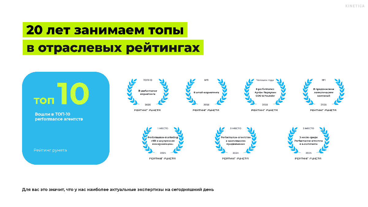 KINETICA — это агентство, которое не боится брать на себя ответственность за результат и постоянно ставит перед собой амбициозные цели. Мы помогаем брендам адаптироваться к изменениям на рынке, внедряем новые подходы и всегда фокусируемся на измеримых результатах. Наши проекты, достижения и награды являются подтверждением нашей экспертизы и готовности вносить реальный вклад в развитие сегмента performance marketing.