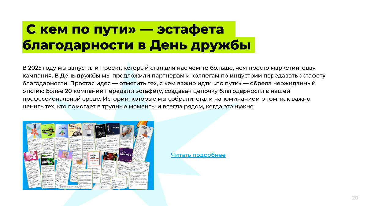 В 2025 году мы запустили проект, который стал для нас чем-то больше, чем просто маркетинговая кампания. В День дружбы мы предложили партнерам и коллегам по индустрии передавать эстафету благодарности. Простая идея — отметить тех, с кем важно идти «по пути» — обрела неожиданный отклик: более 20 компаний передали эстафету, создавая цепочку благодарности в нашей профессиональной среде. Истории, которые мы собрали, стали напоминанием о том, как важно ценить тех, кто помогает в трудные моменты и всегда рядом, когда это нужно